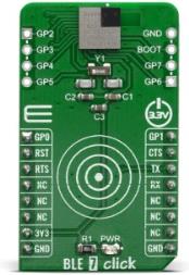 The BLE 7 click is a Click board™ witch provide BT/BLE connectivity for any embedded application. BLE 7 click based on the BGX13S22GA-V31, a SiP module from Silicon Labs with a buit-in antenna. Click board™ an ultra-small, high-performing, Bluetooth low energy module for easy integration of Bluetooth low energy connectivity (BLE) into various electronic devices. Given its features, this click can be used for health, sports, and wellness devices as well as Industrial, home, and building automation; and smart phone, tablet, and PC accessories.