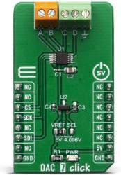 DAC 7 click board™ is supported by a mikroSDK compliant library, which includes functions that simplify software development. This Click board™ comes as a fully tested product, ready to be used on a system equipped with the mikroBUS™ socket.