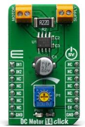 DC MOTOR 14 Click is a PWM chopper type brushed DC motor driver, labeled as TB67H450FNG. This IC includes one channel of motor output block, using a wide range of supply voltages, while delivering reasonably high current to the connected DC motors. Low ON-resistance MOSFETs and a PWM control help the TB67H450FNG exhibit lower heat generation thus efficient motor drive. Furthermore, the TB67H450FNG has two inputs, IN1 and IN2, which allow for selection of the four operation modes; forward (clockwise), reverse (counter-clockwise), short brake, and stop modes.