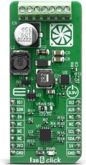 The Fan 6 click is a Click board™ which features EMC2103, an SMBus compliant fan controller with up to up to 3 external and 1 internal temperature channels. The fan driver can be operated using two methods each with two modes. The methods include an RPM based Fan Speed Control Algorithm and a direct PWM drive setting. The modes include manually programming the desired settings or using the internal programmable temperature look-up table to select the desired setting based on measured temperature. And MIC2253 a high power-density, 1 MHz PWM DC/DC boost regulator which allows driving 12V fan.