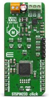 STSPIN233 click is supported by a mikroSDK compliant library, which includes functions that simplify software development. This Click board™ comes as a fully tested product, ready to be used on a system equipped with the mikroBUS™ socket.