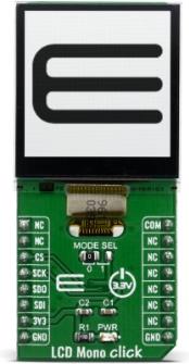 LCD Mono Click is a Click board™ that uses the LS013B7DH03 LCD display from Sharp which combined with the EFM32, from Silicon Labs, and its energy saving capabilities creates a powerful display application. The application is capable of driving a 128x128 pixel display drawing as little as 2 µA while showing a static image. Even when updating the frame every second the current consumption can be lower than 5 µA.