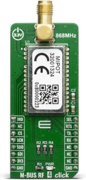 M-BUS RF 4 Click is a mikroBUS™ add-on board with a MIPOT 32001324 RF wireless transceiver. This module operates in the 868 MHz SRD Band. Thanks to its small LCC form factor (15 x 25 mm only) and its low power consumption this module allows the implementation of highly integrated low power (battery operated) solutions for water, gas, heat or electricity metering applications, both on meter or concentrator devices.