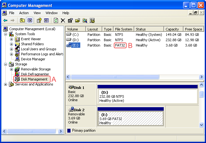 - In Computer Management click on "Disk Management" (point A) and locate your SD-card. It should presently be formatted as FAT32 (point B).