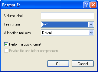 - Click OK. Some warning dialogs appear, one of which informs you that formatting a disk will erase all data on that disk. If you are sure that you have selected the correct disk, and that there is no data on that disk which you are not prepared to lose, then proceed with the format.