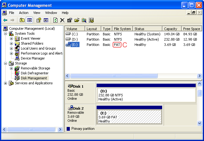 - After a little while your SD-card should be formatted, and should show up with "FAT" under file-system in Computer Management (point C).