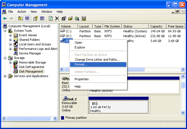 - Right-click on the SD-card and click "Format..."