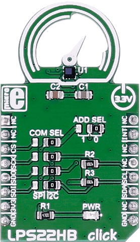 LPS22HB click is an easy solution for adding a digital barometer to your design. It carries the LPS22HB MEMS nano pressure sensor. The click is designed to run on a 3.3V power supply. LPS22HB click communicates with the target microcontroller over I2C or SPI interface.