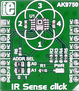 IR Sense click carries the AK9750 quantum-type IR sensor. The click is designed to run on a 3.3V power supply. It communicates with the target microcontroller over I2C interface, with additional functionality provided by the INT pin on the mikroBUS??? line.