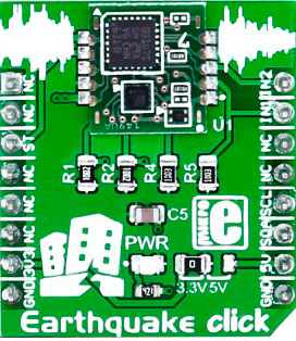 Earthquake click carries D7S, the world’s smallest high-precision seismic sensor from Omron. The click is designed to run on either 3.3V or 5V power supply. It communicates with the target MCU over I2C interface, with additional functionality provided by the following pins on the mikroBUS™ line: PWM, INT, CS.