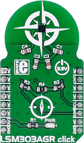 The acceleration and magnetic field data is contained in the onboard chip’s registers, and it can be read out through I2C communication. You'll never lose your way with the LSM303AGR click by your side.