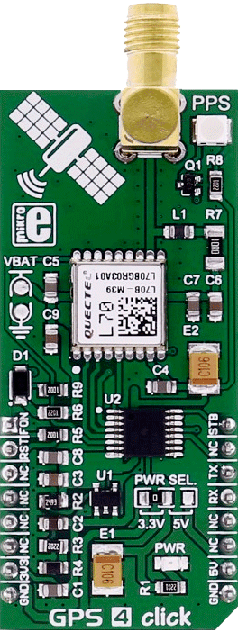 GPS 4 click carries the L70 compact GPS module from Quectel. The click is designed to run on either 3.3V or 5V power supply. It communicates with the target microcontroller over UART interface, with additional functionality provided by the following pins on the mikroBUS™ line: PWM, AN, RST.