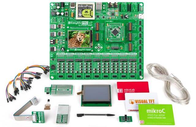 mikroLab for STM32 is a toolkit for developers who want to exploit what ST's STM32 MCUs have to offer. The kit contains an EasyMx PRO v7 for STM32 board, a mikroC for ARM compiler license, additional accessories, and a free VisualTFT license.