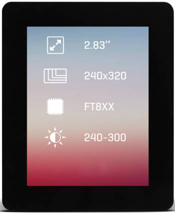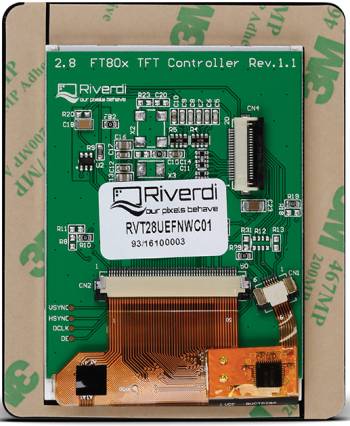 Riverdi Display 2.8" A high-quality cost-effective 2.83" TFT display with optional touch screen and a decorative cover glass (bezel) option on the capacitive touch models. Well integrated with MikroElektronika tools. The 240x320px screen is driven by an FT80x graphic controller which is supported in Visual TFT, the GUI design tool for rapid development of user interfaces.