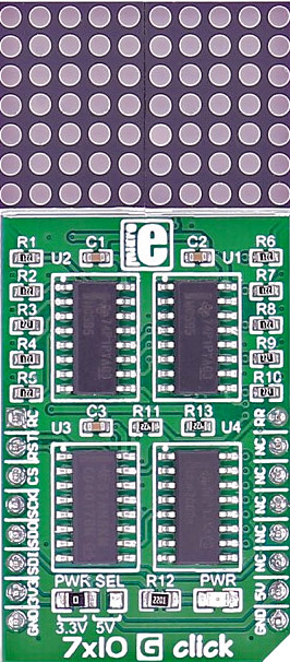 7x10 G click can be used for displaying letters on a display with 7x5 font resolution. It carries a matrix of 70 green LEDs driven by a pair of 8-bit serial-in, parallel-out shift registers, a Darlington Transistor array and a Johnson counter.