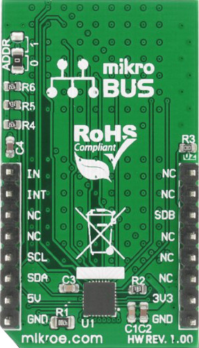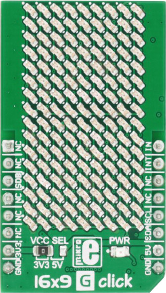 16x9 click 16x9 G click contains a green LED matrix and the IS31FL3731 audio modulated matrix LED driver. The dimension of the LED matrix is 16x9. Each LED can be controlled individually – both for on/off control and light intensity. The click is designed to run on either 3.3V or 5V power supply. It communicates with the target microcontroller over I2C interface.