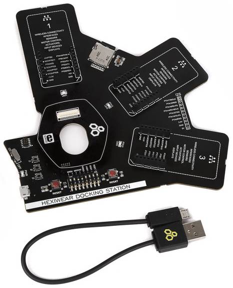 The Hexiwear Docking Station is for developers who want complete control over Hexiwear's hardware. Expand Hexiwear with up to three click boards and turn it into something completely different. Upload new firmware through the USB port using the onboard OpenSDA programmer; or connect an external programmer to the Cortex Debug connector. Expand Hexiwear’s memory with an SD Card. Add audio capabilities using the I2S pinout.
