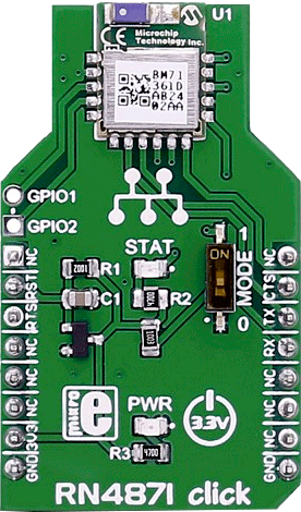 RN4871 click carries the RN4871 Bluetooth® 4.2 low energy module from Microchip. The click is designed to run on a 3.3V power supply. It uses ASCII Command Interface over UART for communication with target microcontroller, with additional functionality provided by the following pins on the mikroBUS™ line: RST, CS, and INT.