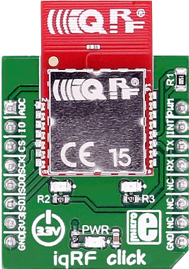 IQRF click carries the DCTR-76DA RF transceiver, operating in the 868/916 MHz frequency. The click is designed to run on a 3.3V power supply. It communicates with the target microcontroller over SPI or UART interface, with additional functionality provided by the following pins on the mikroBUS™ line: AN, RST, PWM, INT.