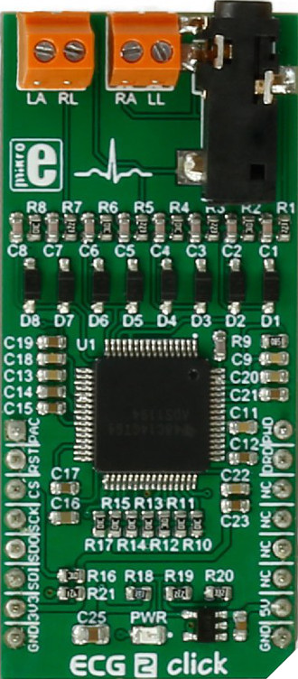 ECG 2 click Track the patterns of your beating heart with ECG 2 click. ECG 2 click contains ADS1194 16-bit delta-sigma analog-to-digital converters from Texas Instruments, a built-in programmable gain amplifier (PGA), an internal reference, and an onboard oscillator.