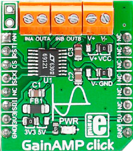 GainAMP click also features three pairs of screw terminals and a power indication LED.
