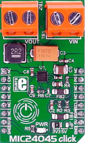 MIC24045 click carries MIC24045 I2C-programmable, high-efficiency, wide input range, 5A synchronous step-down regulator from Microchip. The click is designed to run on either 3.3V or 5V power supply. It communicates with the target microcontroller over I2C interface with additional functionality provided by the following pins on the mikroBUS™ line: RST, INT.