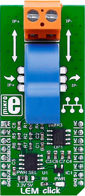 LEM click carries the LTS 6-NP current transducer and MCP3201 ADC converter. The click can measure AC and DC current with exceptional speed, up to 200 KHz. LEM click is designed to run on either 3.3V or 5V power supply. It communicates with the target microcontroller over SPI interface, or directly with analog output.