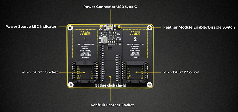 The Feather click sheild comes equipped with two proprietary mikroBUS™ sockets, allowing all the Click board™ devices to be interfaced with the Feather boards with no efforts at all. It is enough to place the small standardized add-on board of your choice on the top of the mikroBUS™ socket - and click it in. That is why this small add-on board is called Click board™ - it just clicks!