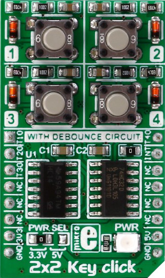 2x2 Key click 2x2 Key click has a 4 button keypad. The click allows multiple key presses and has a debounce circuit composed of 74HC32 quad 2-input OR gate from NXP and the SN74HC14 Hex Schmitt-Trigger Inverter from Texas Instruments. 2x2 Key click is designed to use either 3.3V or 5V power supply. The buttons can be independently read.
