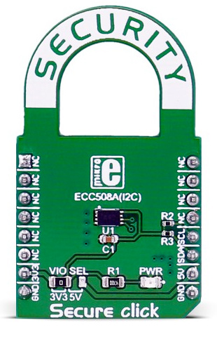 Secure click carries the ATECC508A cryptographic coprocessor with secure hardware-based key storage. The click is designed to run on either 3.3V or 5V power supply. It communicates with the target microcontroller over I2C interface.