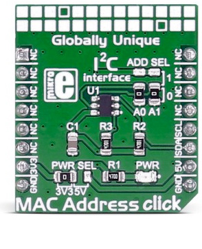 MAC Address click provides a unique node address for your application. It also has 1Kbit of writable EEPROM memory. MAC Address click carries the 24AA025E64 2K I2C Serial EEPROM with EUI-64??? node identity. The click is designed to run on either 3.3V or 5V power supply. MAC Address click communicates with the target microcontroller over I2C interface.