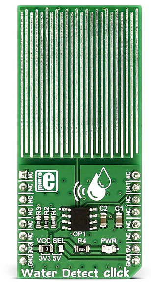 Water Detect click Avoid plumbing and water leakage disasters Water Detect click is used for detecting water and other electroconductive liquids. If the detection area is wet the output of Microchip's MCP606 CMOS op-amp will go positive, signaling the presence of liquid. Water Detect click can be used as a household flood alarm sensor, rain detector for smart buildings or for water tanks that act as a limit switch for a pump.