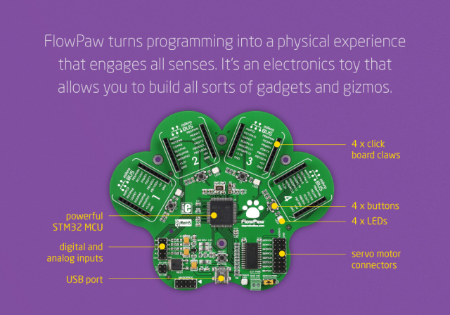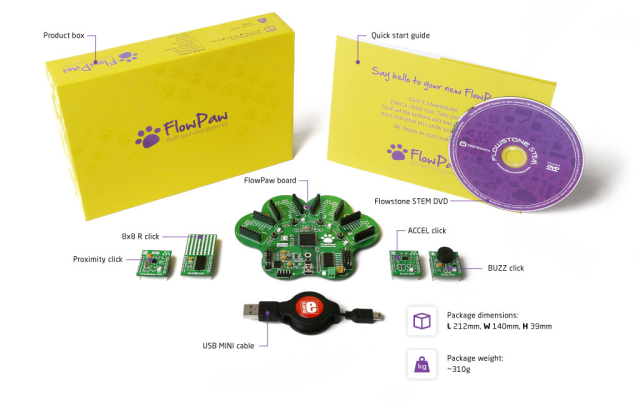 FlowPaw is a development board intended to inspire the next generation of kids to get involved in computer science, engineering and mathematics. It does that by making learning to code fun and engaging, keeping the learner motivated with small wins, and keeping the imagination going with with click boards. The FlowPaw kit comprises the paw-shaped main board, the FlowStone STEM graphical programming software, and four click boards, with additional click board packs sold separately. |