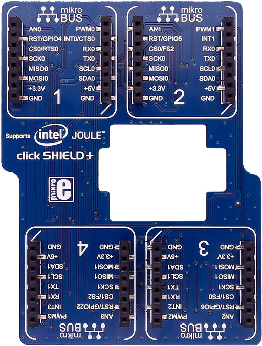 Intel® Joule™ click SHIELD + Intel® Joule™ click SHIELD + is an extension for Intel® Joule™ Expansion Board with four mikroBUS™ sockets. This click shield allows you to add more than 280 click boards™ to your project. Add displays, WiFi, ZigBee or Bluetooth transceivers, Ethernet modules, sensors, MP3 codec circuit and other features to your prototype with ease.