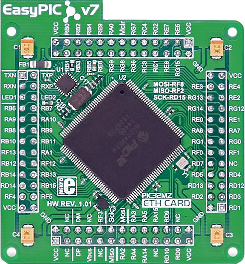 This particular EasyPIC FUSION v7 ETH MCUcard contains the PIC32MZ2048EFH144 microcontroller with on-chip peripherals. It's a great choice for both beginners and professionals. After testing and building the final program, this card can also be taken out of the board socket and used in your final device.