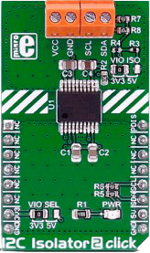 I2C Isolator 2 click I2C Isolator 2 click provides I2C lines and power isolation for slave devices. It carries the ADM3260 dual I2C isolator with an integrated DC-to-DC converter. I2C Isolator 2 click is designed to run on either 3.3V or 5V power supply. The click communicates with the target microcontroller over an I2C interface with additional functionality provided by the PWM pin on the mikroBUS™ line.