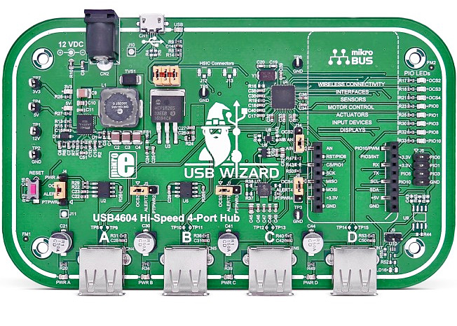 USB Wizard Board can be used as a standalone USB hub, or as an interface to mikroBUS??? socket.