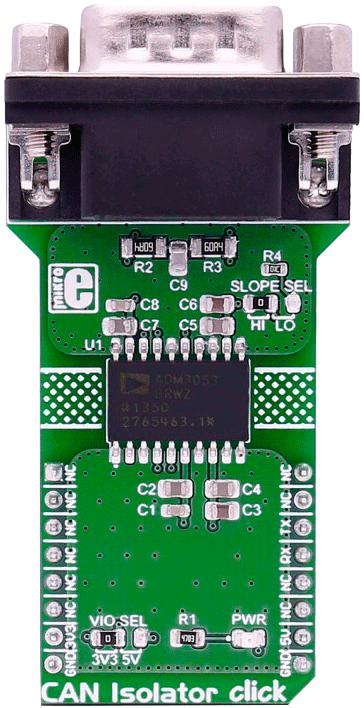 CAN Isolator click provides isolated CAN communication. It carries the ADM3053 signal and power isolated CAN transceiver with an integrated isolated DC-to-DC converter. The click is designed to run on either 3.3V or 5V power supply. CAN Isolator click communicates with the target microcontroller over UART interface.
