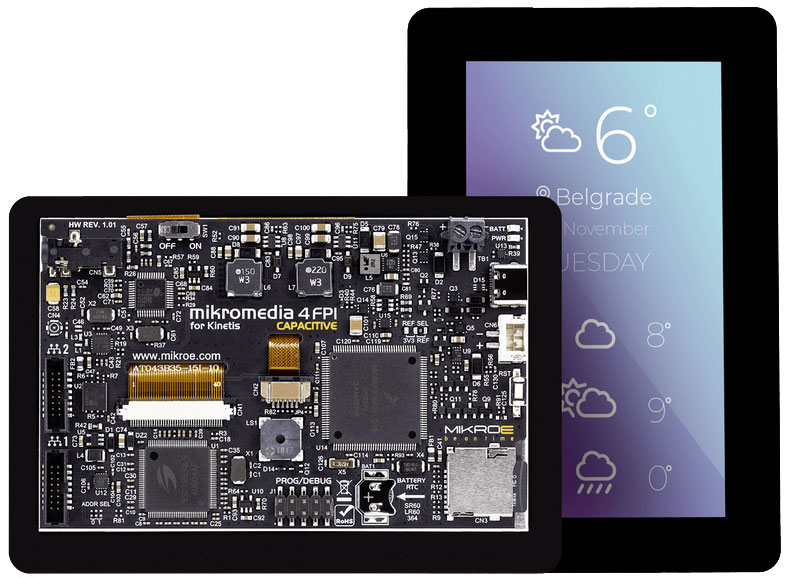 Mikromedia 4 for Kinetis CAPACITIVE FPI with bezel Mikromedia 4 for Kinetis CAPACITIVE FPI with bezel is a compact development board designed as a complete solution for the rapid development of multimedia and GUI-centric applications. By featuring a 4.3" TFT display with capacitive touch screen driven by the powerful graphics controller that can display the 24-bit color palette (16.7 million colors), along with a DSP-powered embedded sound CODEC IC, represents a perfect solution for any type of multimedia application.