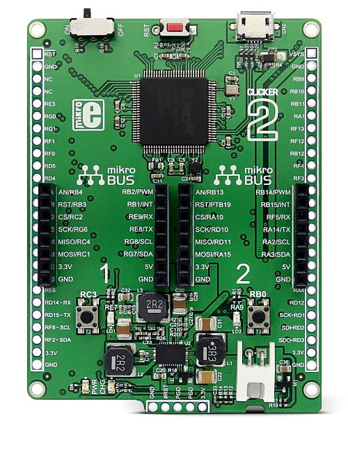 Clicker 2 for PIC32MZ is a compact PIC32 development kit with two mikroBUS sockets for click board connectivity. It carries the PIC32MZ 32-bit microcontroller (1 MB Live-Update Flash and 512 KB SRAM) microcontroller with FPU from Microchip. With a built-in USB-HID bootloader the Clicker 2 for PIC32MZ it easy to program.