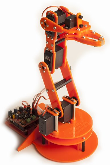 Eduardo 5-Axis Robotic Arm Kit The Eduardo robotic arm is an educational platform for teaching and learning robotics and micro-electronics. The kit is supplied disassembled, so part of the education involves assembly of the arm. The arm has 5 joints, powered by 6 servo motors, driven by an Arduino with motor shield.
