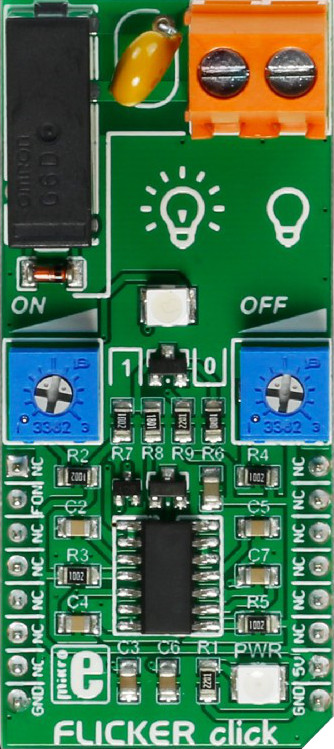 FLICKER click FLICKER click toggles a relay on and off at time intervals which are adjustable with the on-board potentiometers. It is a simple solution if you need to turn a device on and off at specific time intervals, like blinking LED commercials, alarm system lights, or any other signalling lights.