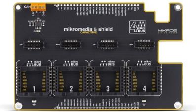 mikroMedia 5" Capacitive shield Mikromedia 5 CAPACITIVE shield is the perfect way to expand the functionalities of your mikromedia 5 CAPACITIVE with 4 mikroBUSâ„¢ sockets - add any functionality from our ever-growing range of Click boardsâ„¢. We are fully stocked with everything from sensors and wifi transceivers to motor control and audio amplifiers.