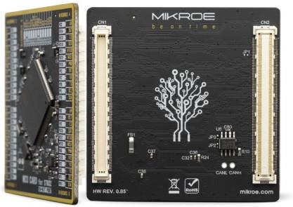 MCU Card is a standardized add-on board, which allows very simple installation and replacement of the microcontroller unit (MCU) on a development board equipped with the MCU Card socket. By introducing the new MCU Card standard, we have ensured the absolute compatibility between the development board and any of the supported MCUs, regardless of their pin number and compatibility. MCU Cards are equipped with two 168-pin mezzanine connectors, allowing them to support even MCUs with extremely high pin count. Their clever design allows very simple usage, following the well-established plug & play concept of the Click board™ line of product.