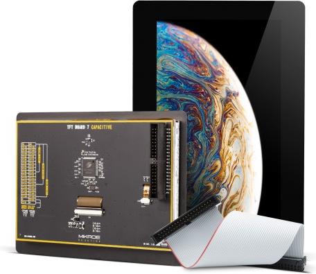 The TFT display module supports up to 24-bit pixel format (RGB: 888), allowing a true-color palette of 16,7 million colors, and resolution of 800 x 480 pixels. It features an excellent contrast ratio and uniform brightness. TFT Board 7 Capacitive, along with other displays from the TFT Board Capacitive line of products, is supported by VisualTFT, a software tool for simplified development of visually oriented embedded applications. This display has an aesthetically pleasing bezel around it, and it also comes with a cable of approximately 16cm. The additional cable provides a fantastic possibility for simple installation of the display anywhere you want. With it you will not be limited with the need to keep the display close to the actual controller.