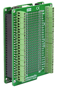 mikroMedia Connect Shield The Connect shield is an extension board, compatible with all mikroMedia boards, which allows you to easily establish connections between your mikromedia board and the surrounding electronics. On-board high-quality screw terminals allow you to connect each pin quickly and without soldering. This is especially convenient in prototype development, but also enables you to integrate the mikromedia board as a final product. A prototyping breadboard area is also available for placing additional components and expanding the base functionality with custom features. The board comes with two female 1x26 pin sockets.