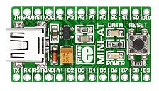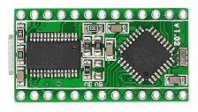 The MINI-AT Board is a small development board containing the ATmega328 microcontroller, designed to fit a DIP26 socket. It features a USB-UART module, reset circuit and indicator LEDs. It comes preprogrammed with an open source USB bootloader from AVRdude. The board can be switched between 3.3V and 5V mode by means of an SMD jumper. |