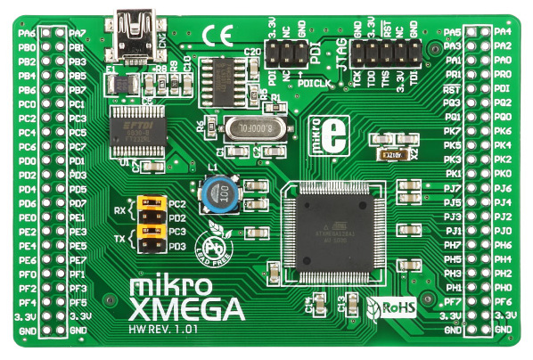 The mikroXMEGA Board is a small-package prototype board with the ATxmega128A1 device operating at 8Mhz. It can be programmed via USB bootloader or through it's JTAG connector. It features a FT232R USB to serial UART interface so that it can be easily connected to a PC. Explore the new XMEGA in an easy way.