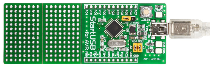 StartUSB for AVR Start USB for AVR Board is a small development board featuring the Atmel AT90USB162 device with fast USB 2.0 support. It features connection pads for all MCU pins, as well as two prototyping areas for placing additional devices and components. It comes with a USB bootloader (no additional programmer necessary) and can be used as a standalone device.