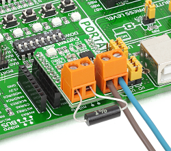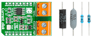 Current click serves as the current measurement device. The board receives current from the output circuit connected to IN(+) and OUT(-) pins of the first screw terminal. INA196 IC converts this current into a voltage. The second screw terminal is used for the external shunt.
